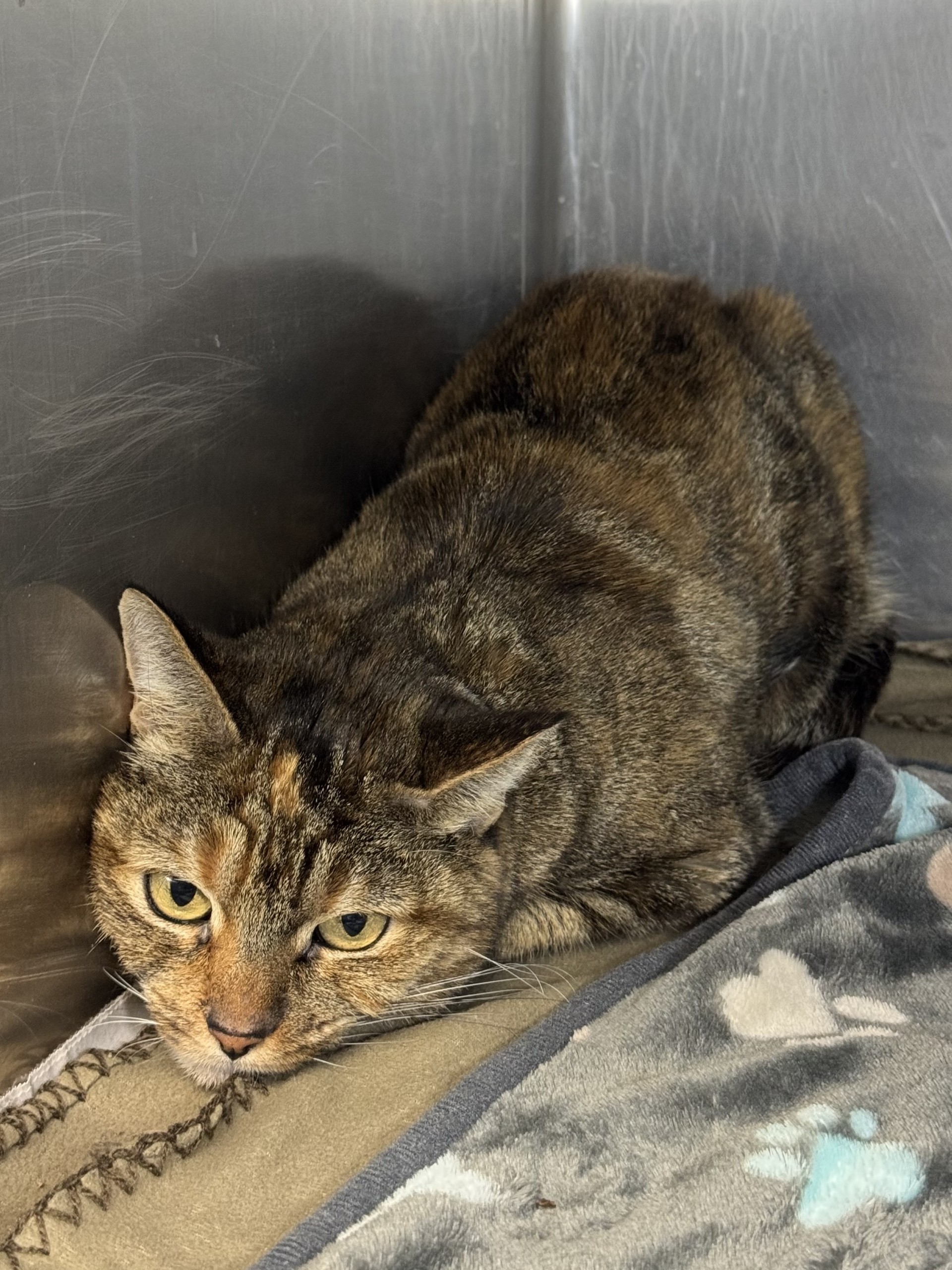 26-06733 is a brown/black, female adult dog, that weighs approximately 65 lbs. The intake date was 1/14/2026 from the City of Paramount.